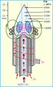當感應線圈與高頻發生器接通時,高頻電流流過負載線圈,并在炬管的軸線方向產生一個高頻磁場。若用為電火花引燃,管內氣體就會有少量電離,電離出來的正離子和電子因受高頻磁場的作用而被加速,當其運動途中,與其它分子碰撞時,產生碰撞電離,電子和離子的數目就會急劇增加。此時,在氣體中形成能量很大的環形渦流(垂直于管軸方向),這個幾百安培的環形渦流瞬間就是氣體加熱到近萬度的高溫。然后式樣氣溶膠由噴嘴噴入等離子體中進行蒸發、原子化和激發。